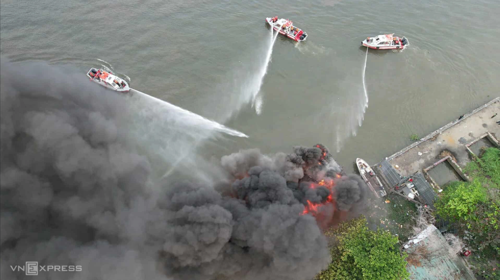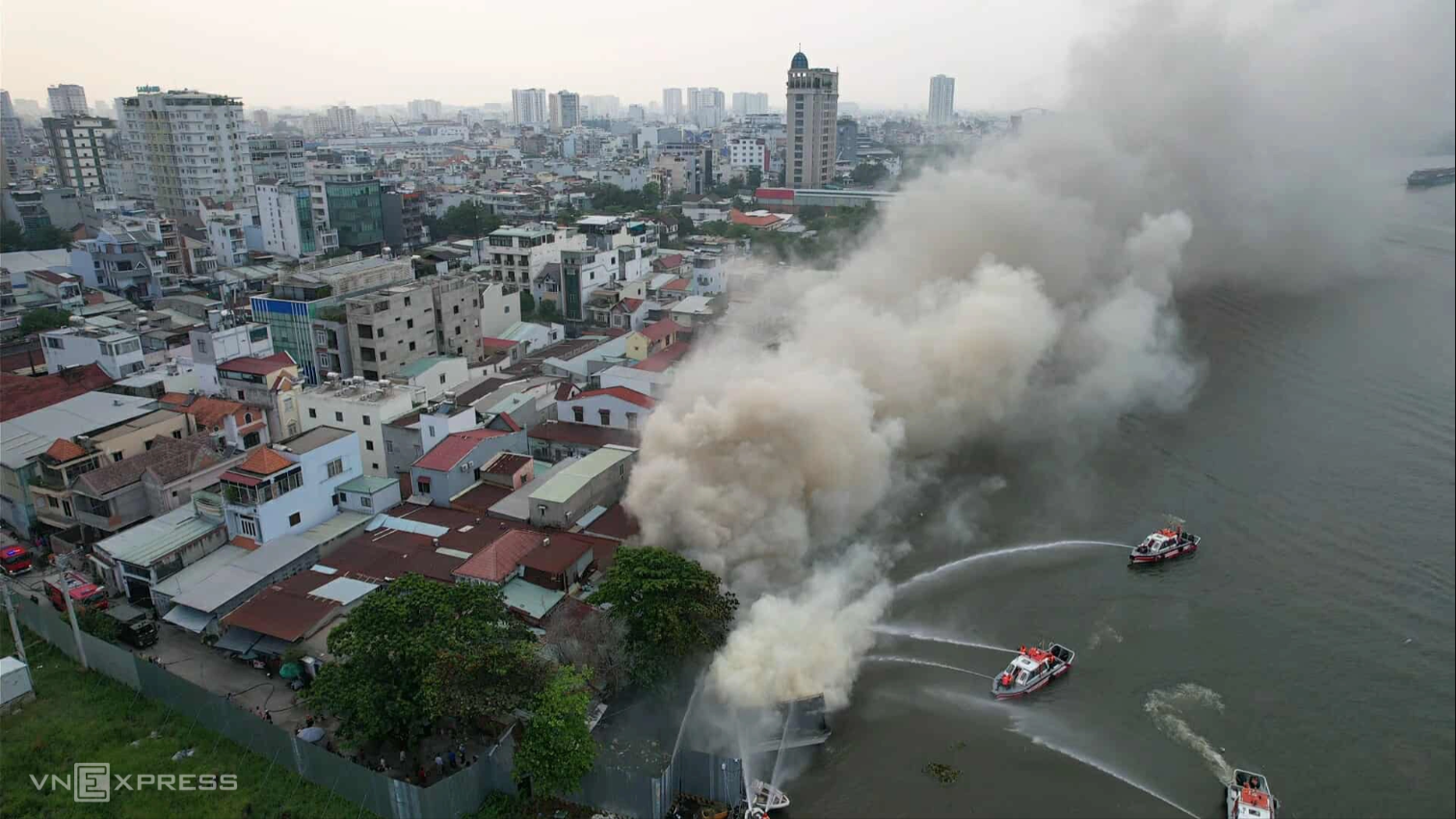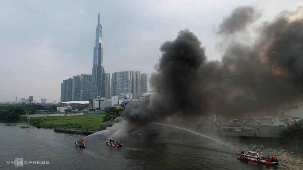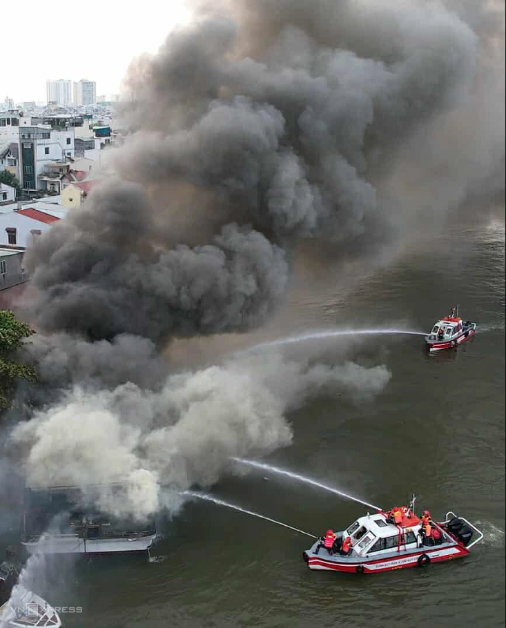 TP HCM - Ngọn lửa bao trùm du thuyền, khói đen mù mịt, lan sang khu dân cư ở ven sông Sài Gòn, chiều 7/1