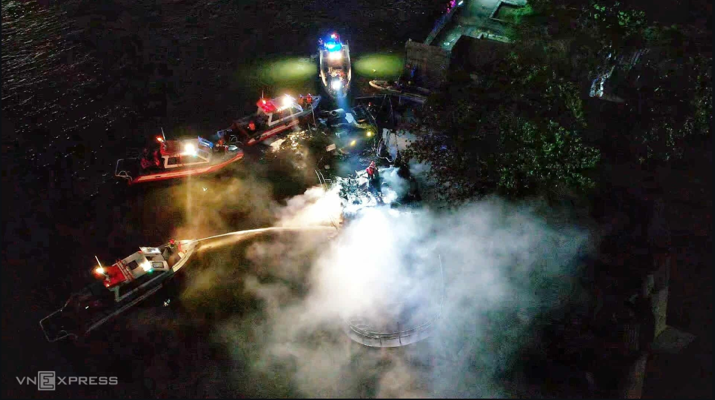 Phòng Cảnh sát Phòng cháy chữa cháy và cứu nạn, cứu hộ Công an TP HCM điều động xe và lính cứu hỏa đến hiện trường. Bốn canô cứu hỏa áp sát tàu bị sự cố để phun nước dập lửa.